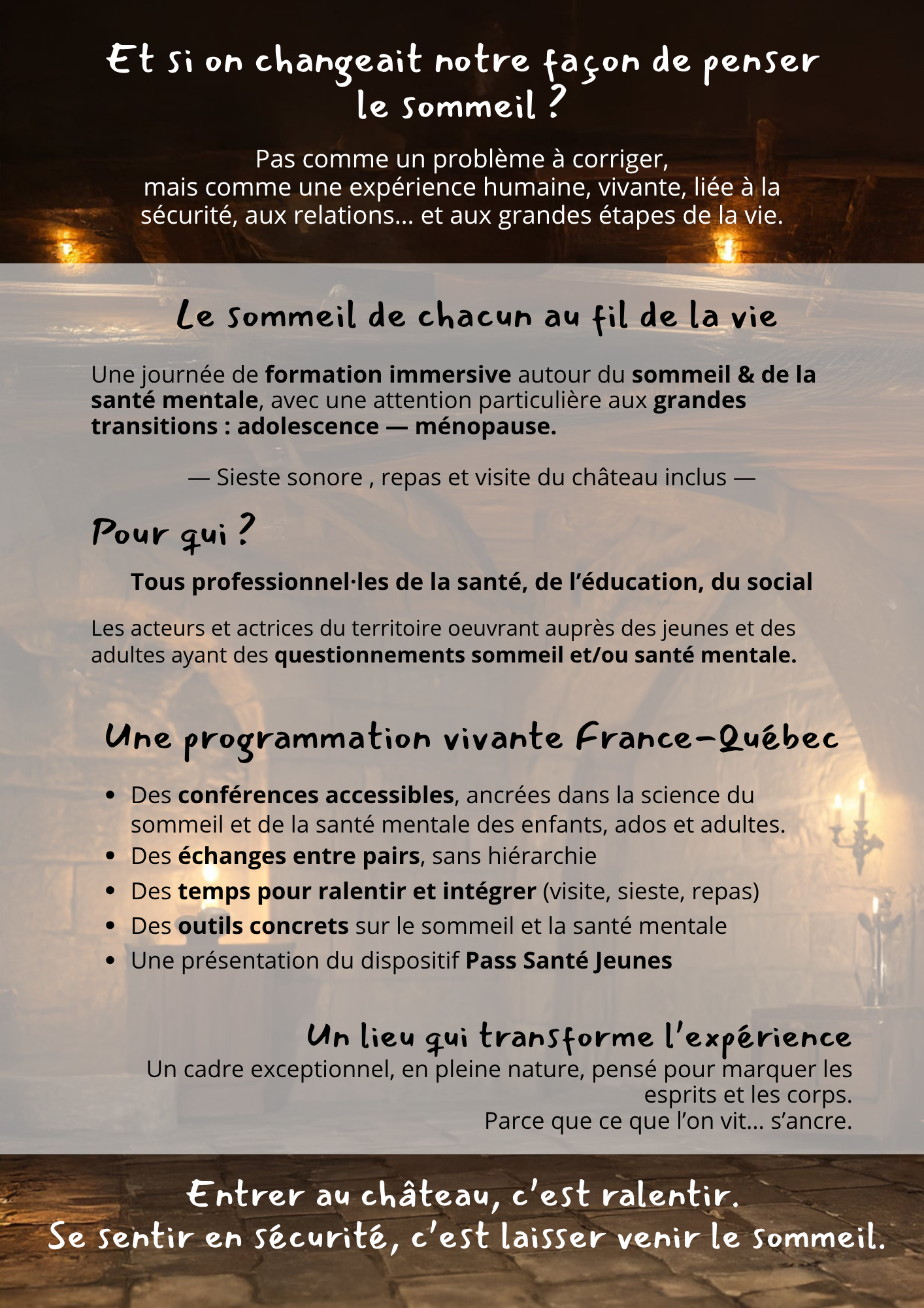Cette journée immersive s’adresse aux professionnel·le·s de la santé, du bien-être, de l’éducation et du social, ainsi qu’aux acteurs du territoire accompagnant des publics concernés par des enjeux de sommeil et de santé mentale.